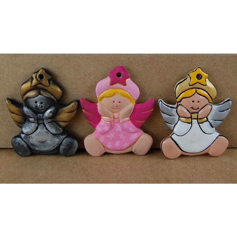 Bisque plain Angel hanging decoration complete with hole for ribbon or cord of your choice. An ideal Christmas tree decoration. This plain bisque item can be decorated by selecting from our range of products to include Underglazes Glazes and Pottery Colour - Decopatch - DecoArt Paints Varnishes and Mediums - Craft Colour which include Oven Pens Inks and Foils. We also have a range of Decorating and Display Supplies. Just visit our Products section of the web site. Dimensions: 9.5cm H by 7.5cm W Sold in packs of 24 CLMC293 CLMC293 MPN MC204