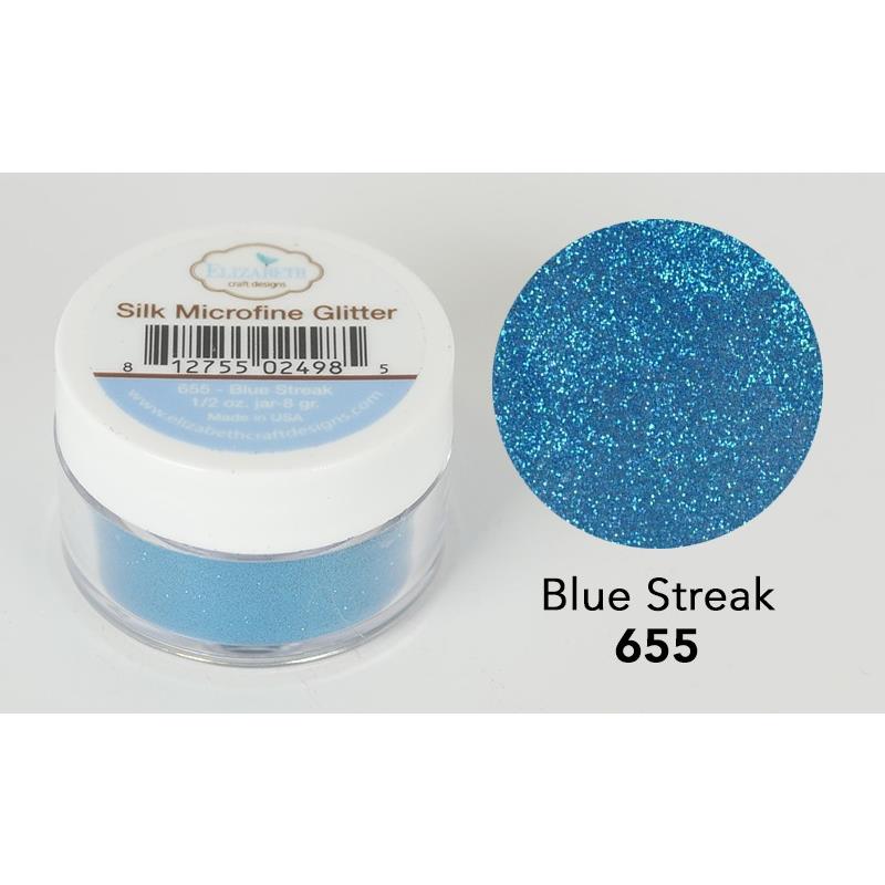 Blue Streak Microfine Glitter. Silk Microfine Glitter is a high quality glitter with an amazing shine. Perfect for adding a sparkle to your card making, scrapbooking and other craft projects. When combined with Double Sided Adhesive tape by Elizabeth Craft Designs, Inc. and the "Polished Silk" Technique the results are spectacular. comes in a 1/2 oz. jar. 655 ECD655 ECD655 MPN 655