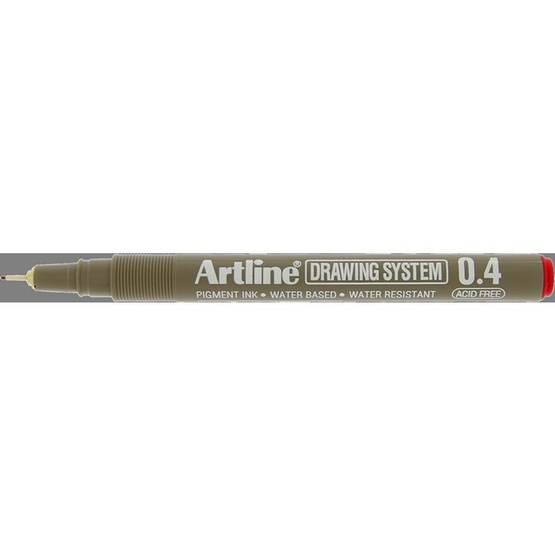 EK234 0.4 Drawing Pen Red. Artline drawing system pens are a professional pen for technical drawing, illustration & graphic design. The pens contain a water based pigment ink that is acid & Xylene free which is also highly water resistant and fade proof. A friction proof nib enables Artline drawing pens to provide a consistent line width. It is protected with a metal reinforced collar for added strength. This also allows the pen to be used with rulers and stencils without causing any damage to the nib. Artline drawing system pens have nine different nib widths which are 0.05mm, 0.1mm, 0.2mm, 0.3mm, 0.4mm, 0.5mm 0.6mm, 0.7mm & 0.8mm.  ART234RD         ART234RD ART234RD  MPN ART234RD