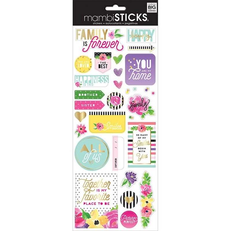 Family is Forever Keep your memories forever by recording them on a beautiful page using the Family is Forever with Foil Accents MAMBI Sticks Cardstock Stickers from Me and My Big Ideas. Included in the package is one 5" x 12" sheet of cardstock stickers, some with foil accents, featuring family themed expressions, flowers and hearts. SPX-335 MMBSPX-335 MMBSPX-335 MPN SPX-335