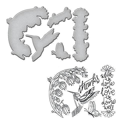 Spellbinders_February_2017. This Hummingbird Stamp and Die Set from the Spring Love Collection by Stephanie Low brings both worlds together of die templates and coordinating stamps to give these images life! These cling foam (EVA) rubber stamps are designed to be used with an acrylic block. This set includes five stamps with five coordinating dies. When Spring is in the air, life begins anew. Stephanie continues to astound with her stunningly beautiful hand drawn imagery of your favourite flora and fauna. No matter the colouring medium, from alcohol markers to watercolour, these detailed rubber stamps are waiting to be coloured in and with detailed dies, exactly cut to be incorporated into all of your cards and projects. Approximate Size: Stamps: 4.50 x 3.50 in Dies: 4.00 x 3.75 in SDS-059 SBSDS-059 SBSDS-059 MPN SDS-059