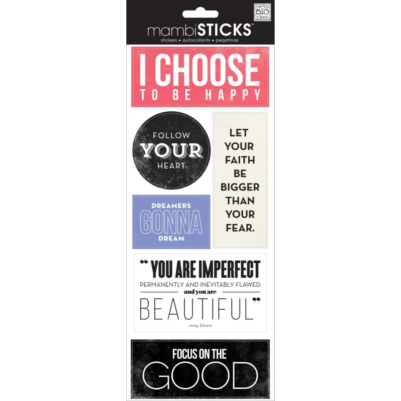 Me&My Big Ideas Stickers have become a staple in every scrapbook. They are acid-free and lignin-free. Sticks I Choose- 6 stickers with captions of "I Choose To Be Happy", "Follow Your Heart", "Dreamers Gonna Dream", "Focus on the Good" and other inspirational quotes. Colours are Black, White, Coral, Purple, and Ivory. STP-253 MMBSTP-253 MMBSTP-253 MPN STP-253