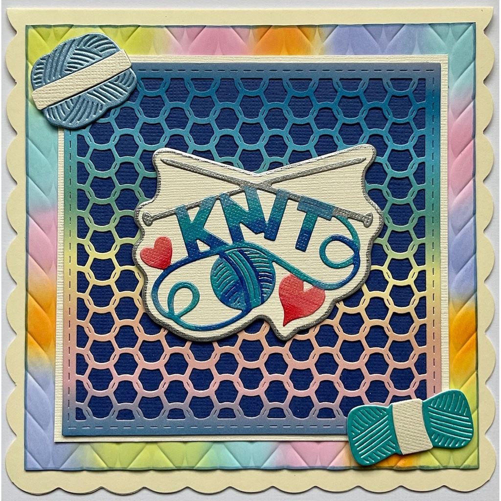 Knitting or yarn balls, needles, crochet hooks and sentiments: Knit; I'm Hooked on You; I heart Yarn. This dies cuts, embosses and scores. Fits almost all of the leading die cutting machines. SDD625
