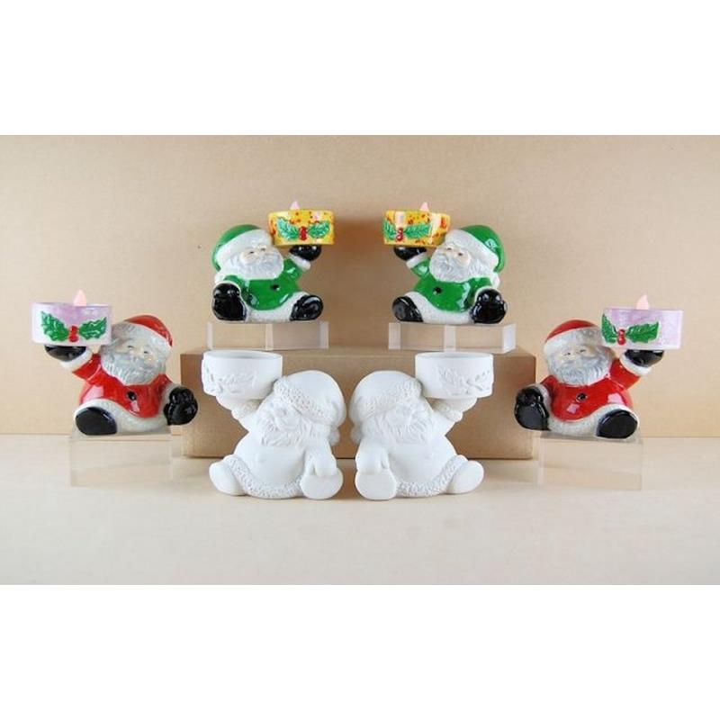 Plain BisquePairs of mixed style Sitting Santa T Light holder ornaments in earthenware ceramic. Ideal mantle Christmas decoration pieces. A paint your own pottery blank or plaster shape. Paint item with poster paints acrylics and finish/seal with a coat of craft varnish. Alternatively to make the item more durable paint or decorate shape with underglaze or glaze and fire in a kiln. Great for parties and craft projects fundraising schemes schools etc. Ideal to personalise or customise as a Christmas home decor piece. Dimensions: 11.5cm [h] x 12cm [w] including the T Light holder. Sold as a BOX of 6 - [2 mixed styles of Santas per pair] ** T/Lights are not included with these bisque pieces. CLMC398 CLMC398 MPN