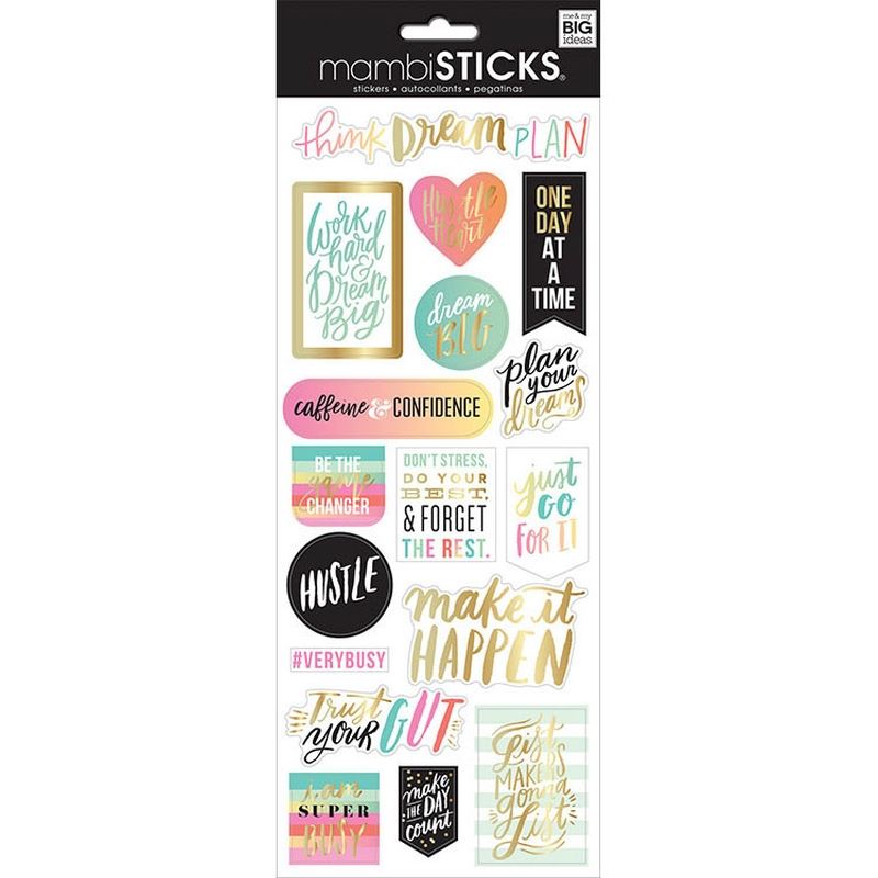 Think Dream Plan Accent a dream board, journal, planner and more with the Think Dream Plan with Foil Accents MAMBI Sticks Cardstock Stickers. The included 5" x 12" sheet of cardstock stickers features motivational phrases and some stickers have foil accents. SPX-340 MMBSPX-340 MMBSPX-340 MPN SPX-340
