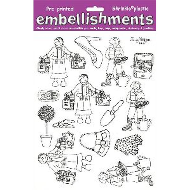 Shrink Art Embellishment A4 Jolly Nation Shopping/Gardening Shrink Art A4 sheet of Embellishments Simply colour cut & shrink to embellish your cards bags tags scrapbooks stationery & jewellery 2018 SPSA2018 SPSA2018 MPN 2018