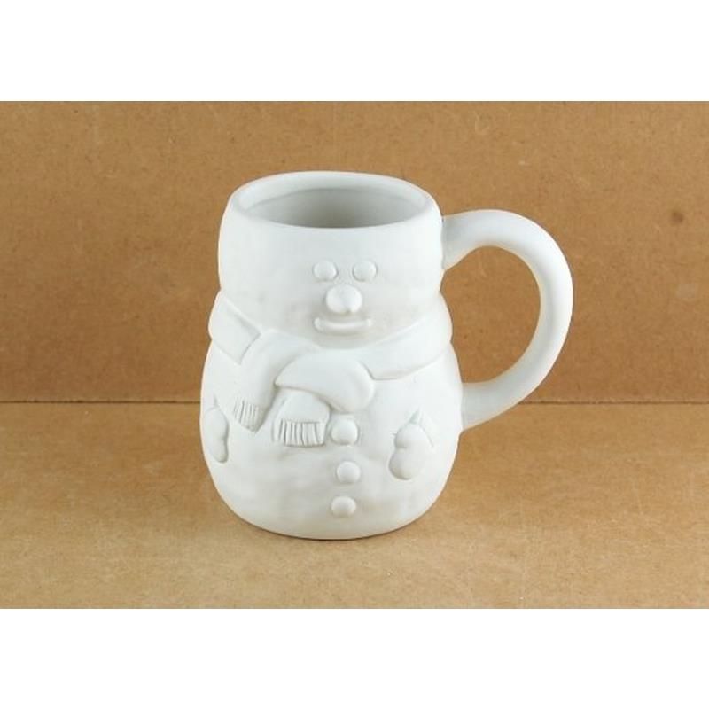 Bisque novelty mug with embossed snowman with scarf and gloves in earthenware ceramic. A paint your own pottery blank or plaster shape. Paint item with poster paints acrylics Decopatch or decoupage and finish/seal with a coat of craft varnish. Alternatively to make the item foods-safe and more durable paint or decorate shape with underglaze or glaze and fire in a kiln. Great for parties (craft party birthday party hen party) corporate team building events home d cor interior design community and craft projects fundraising schemes schools etc. Dimensions: 12cm (H) x 7.5cm (Dia) Sold in Boxes of 6 CLMC114 CLMC114 MPN MC114