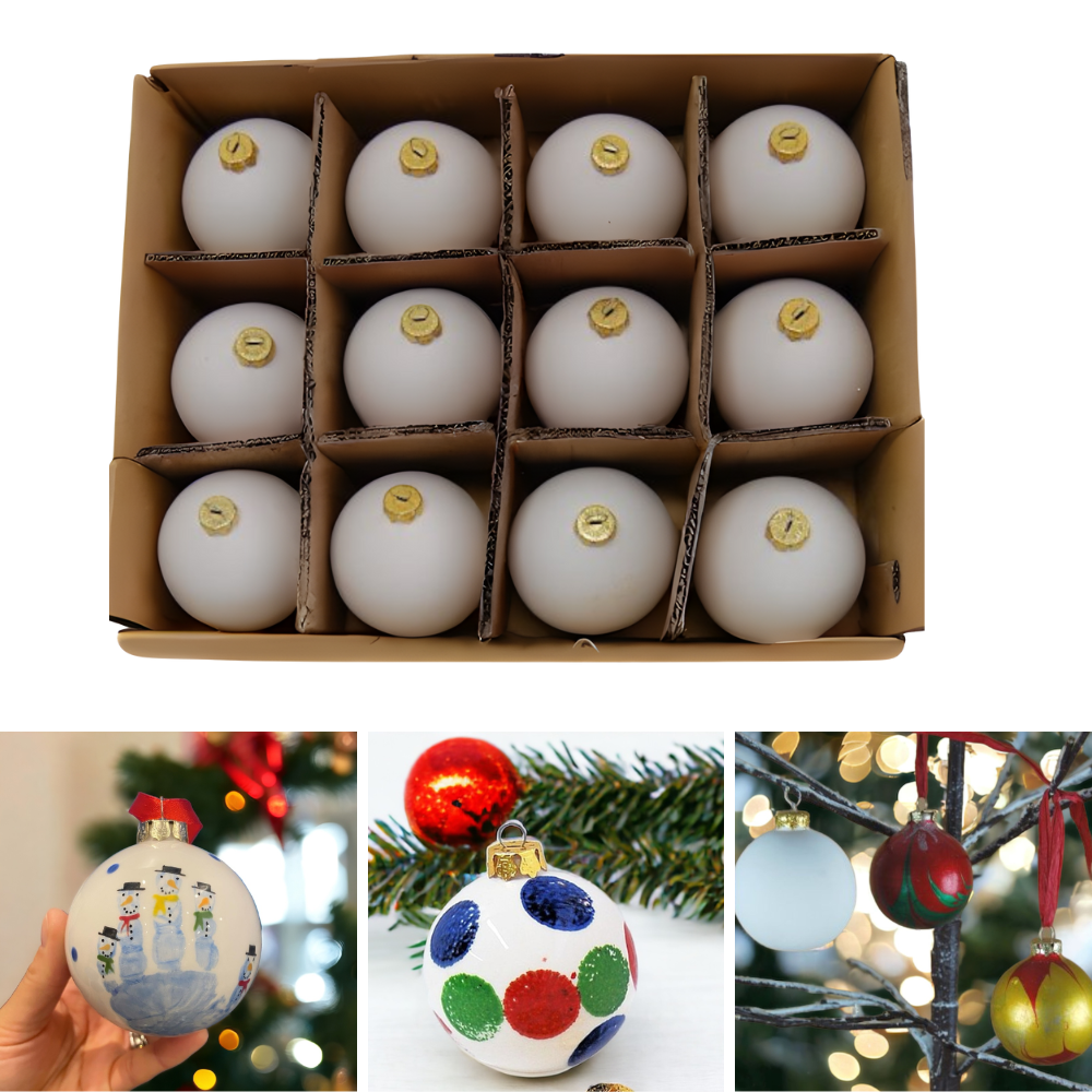 These Christmas Tree Bauble Bisque Blanks (Large Ball) are earthenware ceramic ornaments supplied in a box of 12. Each 7.5 cm bauble is ready to decorate with poster paints, acrylics, or sealed with a craft varnish. For a durable, food-safe finish, they can also be decorated with underglaze or glaze and fired in a kiln.